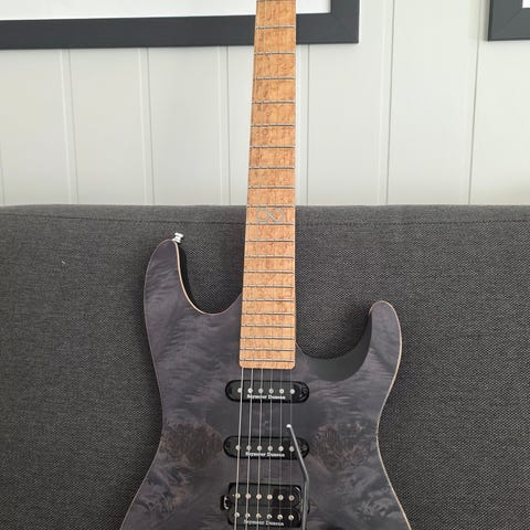 ML1 Pro Modern elektrisk gitar med 6 strenger. Kroppen har topp i mørkbeiset naturtre med synlig trestruktur og to humbucker-pickuper. Gitaren har fast stol, volum- og tonekontroll samt pickup-bryter. Lønnshals med skrudd konstruksjon og gripebrett med dot-inlays. Bakside i høyglans svart finish. Passer til elgitarspill i ulike sjangre, både øving, innspilling og bruk i band.