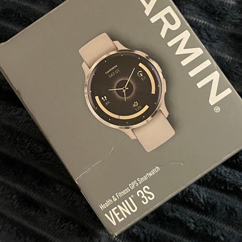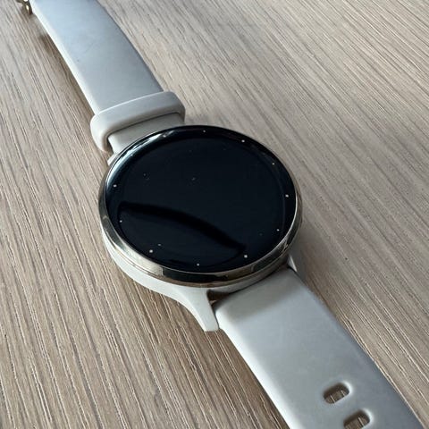 Modellen er en Venu 3S, som er en kompakt smartklokke med rund skjerm. Den har berøringsskjerm og støtte for ulike aktivitets- og helsefunksjoner. Klokken er perfekt til daglig bruk, trening og aktivitetsregistrering, og kan kobles til kompatibel smarttelefon for varsler og andre smartfunksjoner.