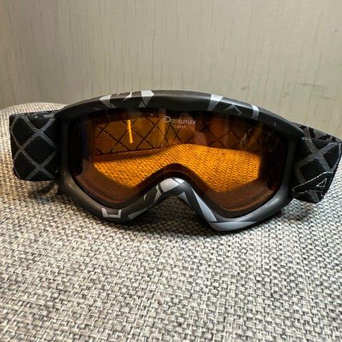 Skibriller med oransje linser og ramme i kamuflasjemønster. Justerbar svart stropp med mønster for bedre feste rundt hjelm eller lue. Egnet til bruk i skibakken eller andre vinteraktiviteter der øyebeskyttelse mot vind og snø er ønskelig.