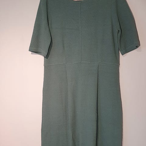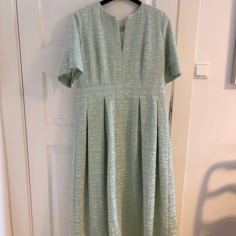 Noa Noa festkjole for dame i størrelse XL. Kjolen er grønn og laget av bomull, modal, polyester og elastan. Den har kort erm og et strukturert mønster i stoffet, som vist på detaljbildet. Passer til bruk ved ulike anledninger der en enkel, ensfarget kjole ønskes.