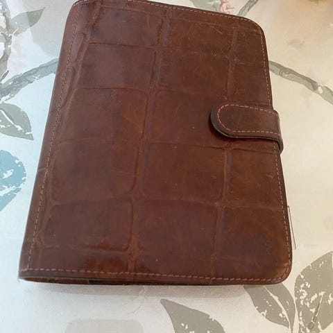 Mulberry lær organizer i brun farge for unisex. Modellen har krokodillepreget lær på utsiden og lukkes med stropp og trykknapp. Innvendig har den ringperm-mekanisme for innstikk, flere plastlommer, kortlommer og en glidelåslomme. Egnet til oppbevaring av notater, kort, kvitteringer eller lignende småting i hverdagen.