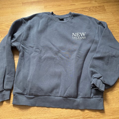 H&M collegegenser for dame i størrelse L. Genseren er svart og laget i bomull. Den har rund hals og ribbekanter ved hals, ermer og nederkant. Fronten har trykkmotiv med tekst. Passer som hverdagsplagg eller til avslappet bruk.