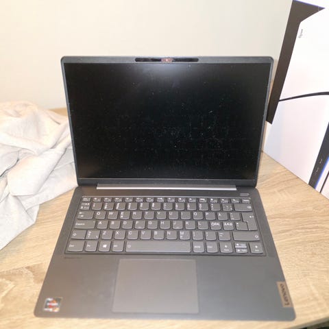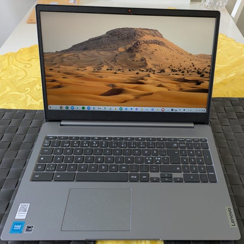 Lenovo Chromebook bærbar PC med 14-tommers skjerm i blå farge. Selges da jeg ikke hadde behov for to laptoper. Supert å ha med på farten, og lav vekt. Enheten kjører ChromeOS og har tastatur i full størrelse med styreflate under. Høyttalere er plassert på hver side av tastaturet. Maskinen har kompakt og slank utforming, egnet for nettbruk, dokumentarbeid og andre oppgaver i nettleserbaserte miljøer. Leveres i blå utførelse med Lenovo-merking på lokket og Chromebook-logo på oversiden.