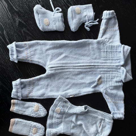 Lillelam heldress og lue til baby i merinoull, unisex. Sett i hvit farge med strikket mønster. Heldressen har lange ermer og ben, ribbekanter og glidelås foran. Lua har øreklaffer, knyting under haken og dusk på toppen. Størrelse 52, egnet for nyfødt. Lue er i størrelse 36-38.