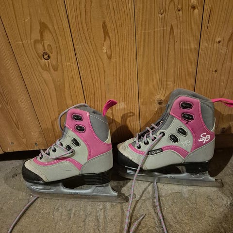 Frost barne skøyter i størrelse 32-35. Justerbare skøyter med hard yttersko og myk, fôret innersko. Fargekombinasjon rosa og grå med dekor. Lukkes med spenner og stropp for god tilpasning rundt foten.