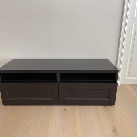 TV benken var i utgangspunktet hvit, men har vært malt med Jotun Dempet Sort, og har litt bruksmerker og slitasje av bruk. Men den er hel og fin, og blir så god som ny igjen med et nytt strøk maling.