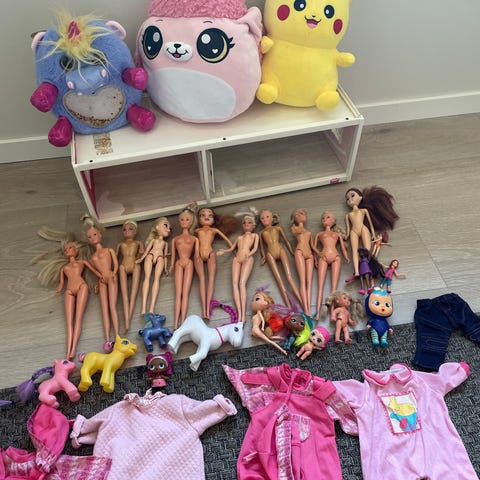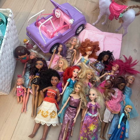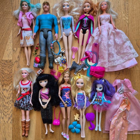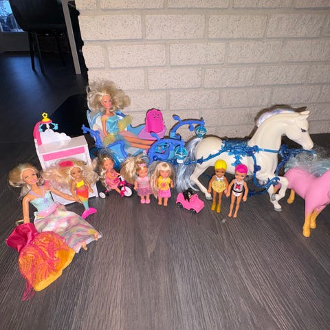 Barbie dukker sett. Inneholder flere Barbie-lignende motedukker i ulike antrekk og hårfarger, samt tilbehør som hest og myk kosedyrfigur. I tillegg følger det med en større dukke inspirert av en eventyrfigur med kappe og støvler. Egnet til rollelek og fantasilek for barn som liker dukker og tilbehør.Anna koster 399. Ny.