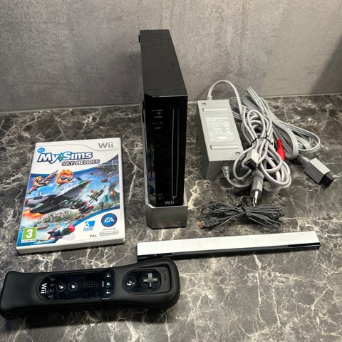 Nintendo Wii konsoll i svart farge. Pakken inneholder konsoll, strømforsyning, AV-kabel, sensorbar og en Wii Nunchuk-kontroller. I tillegg følger det med flere spill til Wii-plattformen, blant annet titler fra The Legend of Zelda-seriene samt Nintendo Land. Egnet for bruk med kompatible Wii-kontrollere og tilkobling til TV via medfølgende kabler.