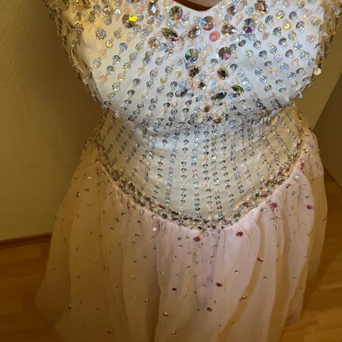 Kjolen er rikt dekorert med håndsydde perler og krystaller, og har et voluminøst tyllskjørt som gir en flott silhuett. Perfekt til ball, gallafest, julebord, selskap eller photoshoot.