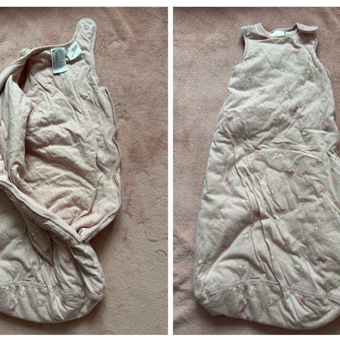 Name it sovepose for barn i størrelse 50-56. Soveposen er laget i bomull og har rosa farge med mønster. Modellen er ermeløs og har glidelås i front som kan åpnes helt ned for enkel av- og påkledning.
