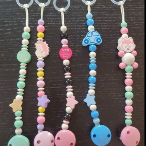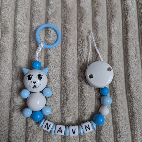 Lager også vanlige smokkesnorer med motivperler både med og uten navn.