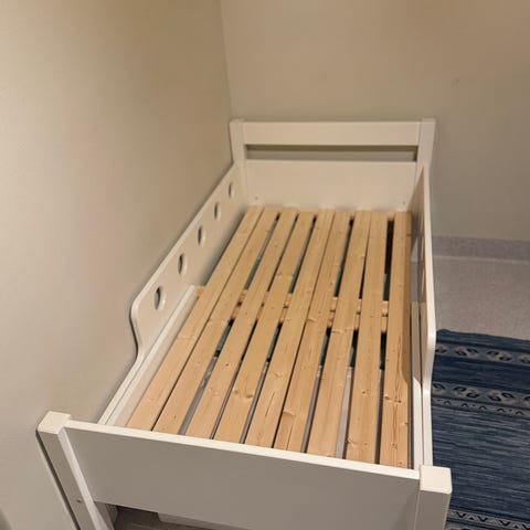 Veldig praktisk vokseseng for barn. Begge endene på sengen kan vippes opp slik det vises på venstre side på bildet. Begge endene kan også vippes ned. Det gjør at sengen fungerer godt helt fra barnehagealder til voksenalder. Sengen er penest fra denne siden, hvor det er noe bruksslitasje/småmerker. På baksiden er det noen klistremerker (fra Frost), og den er ikke like pen. Setter man siden med klistremerkene inn mot veggen, så er det en fin seng. Sengen har ellers ingen skader. Ønsker at sengen hentes innen førstkommende mandag (23.02).