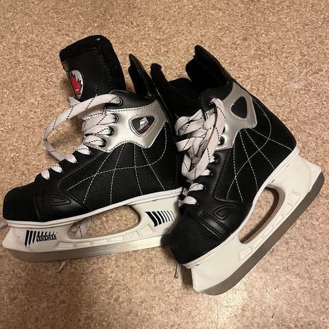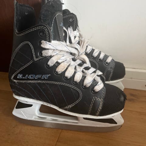 Ishockeyskøyter for barn i størrelse 34. Modellen er i svart og hvit med snøring og polstret ankelparti.
