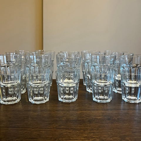 Dramglass i klart glass. Glassene har fasettert bunn og enkel, glatt kant øverst. Selges samlet.