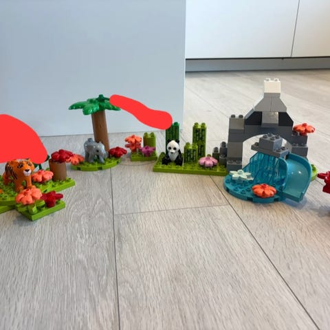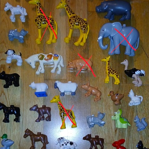LEGO DUPLO dyrefigurer blandet sett. Inneholder ulike dyr i DUPLO-størrelse, blant annet hester, kyr, sebra, løver, høne og kyllinger. Figurene er laget i plast og passer til andre LEGO DUPLO-sett. Egnet for små barn som tilbehør til gårds- og dyrelek.
