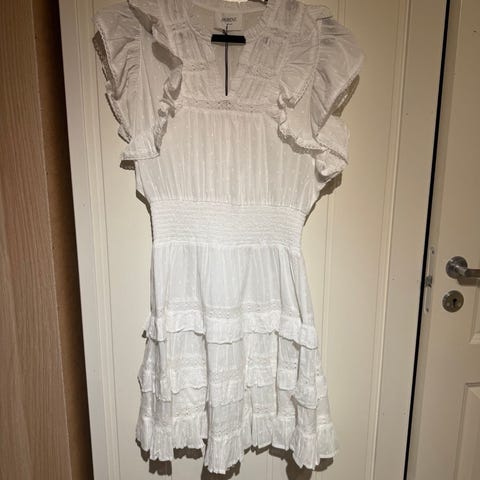 OSMINE af Nor sommerkjole i bomull for dame i størrelse M. Kjolen er flerfarget med lys, blomstrete mønster. Den har v-hals, korte puffede ermer og markert midje med elastikk. Skjørtet er langt med flere volanger og broderte hullpartier som gir struktur i stoffet. Passer til bruk på varme dager, ferie og andre uformelle og formelle anledninger.