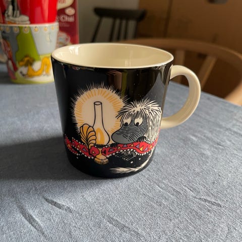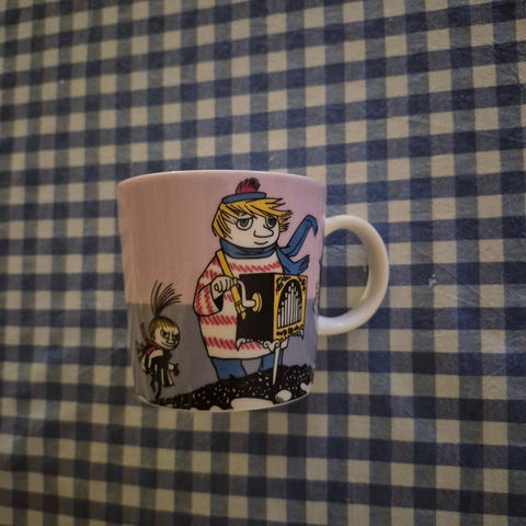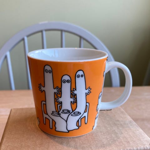 Arabia Mummi kopp i oransje farge med Mummi-motiv. Koppen har hank og er egnet til varme og kalde drikker. Passer til daglig bruk på kjøkkenet eller som del av en Mummi-samling.