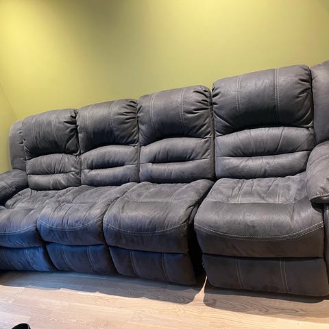 Svart massasje reclinersofa med kontroll. Viser synlig slitasje på enkelte sitteflater, se bilder for detaljert tilstand.