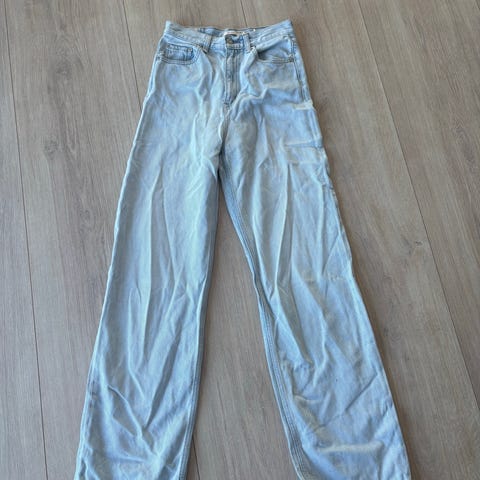 Litt slitt nederst. Ellers ingen bruksmerker. Bik Bok jeans i blå denim for dame. Buksen har rett passform med lengde L32 (oppgitt i linningen). Størrelse er merket som 32 og midjemål som W36. Klassisk 5-lommersmodell med gylf med glidelås og knapp. Stoffet er i denim/bomull med lys vask og svakt mønster i stoffet. Passer til hverdagsbruk og kan kombineres med ulike topper og gensere.