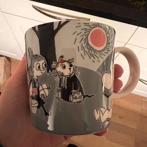 Arabia Mummi kopp i keramikk med rosa bakgrunn og motiv av Mummifigur. Koppen har hank og er egnet til servering av varme og kalde drikker ved borddekking på kjøkken eller spiseplass.