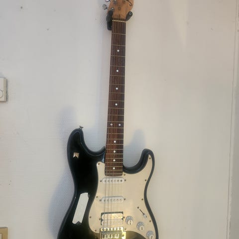 Elektrisk gitar med svart kropp og hvitt plekterbrett. Gitaren har tre single-coil pickuper, volum- og tonekontroller samt 5-veis pickup-bryter. Den har tremolo-bro med tilhørende arm. Halsen er i tre med gripebrett med båndmarkeringer. Passer til elgitarspill innen ulike sjangre som rock, pop og blues.