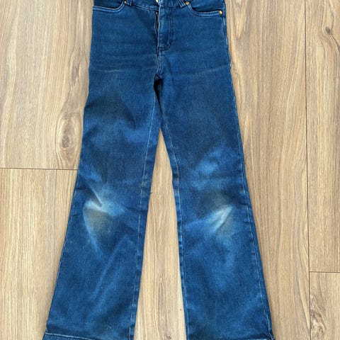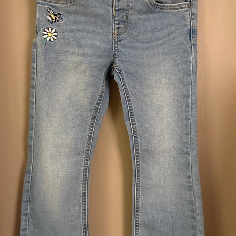 H&M jeans for jente i størrelse 152. Buksen er i blå denim av bomull. Den har glidelås og knapp i front, beltehemper i linningen og rette ben. Nederst på bena er det dekorativ broderikant med bladmønster. Egner seg til hverdagsbruk og kan kombineres med ulike topper og gensere.