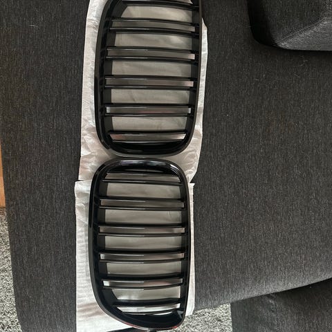 BMW frontgrill / nyregrill i svart plast med vertikale ribber. Ett av grillene har ribber i M-fargene (blå, lyseblå og rød) på noen av lamellene. Passer som erstatningsgrill eller oppgradering av original frontgrill på aktuell BMW-modell, avhengig av riktig passform og festepunkter. Kontrollér mål, form og festeanordning mot eksisterende grill på bilen før montering.