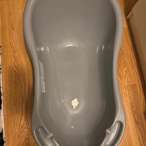 Badestøtte til baby. Plastmaterialet gjør den enkel å rengjøre etter bruk.