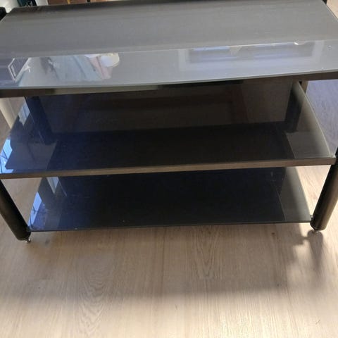Stereo benk, hylle med glass dør og hylle pent brukt i foliert bok.