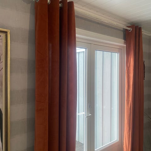 Pent brukt. Velour gardiner som henger veldig fint. Med maljer. Fin okergul farge. Selges samlet.
