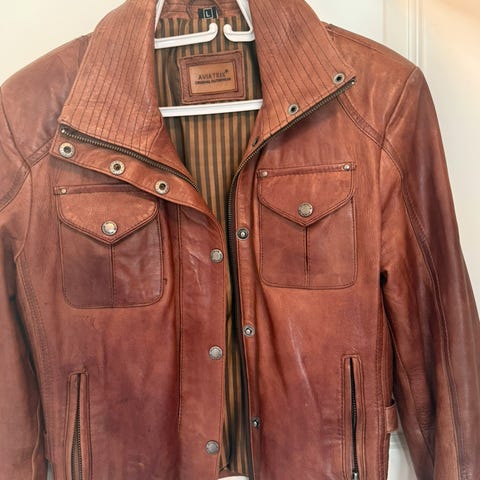Brun skinnjakke fra Massimo Dutti, str XS/34. Pent brukt. Et par små merker ved lomme fremme (se bilde). Ellers i god stand.