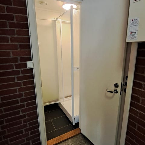 Dusjkabinett med svarte profiler og dusjkar