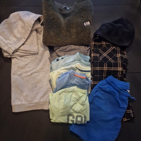 Tre bukser, hettejakke fra adidas, tskjorte fra zara og skjorte.