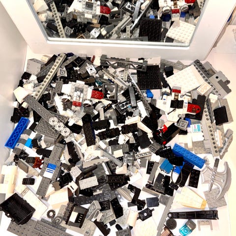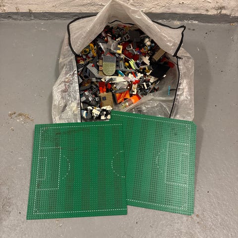 5 kg LEGO blandet klosser og baseplater selges billig pga flytting. Inneholder ulike typer LEGO-klosser i flere farger og størrelser, noen hjul og vogndeler, samt minst én minifigur/figur. Det følger også med grønne baseplater som kan brukes som underlag til bygging. Passer til fri bygging, konstruksjon av kjøretøy, bygninger og andre egne prosjekter med LEGO-klosser. Pent brukt. Det følger også med en oppbevaringsboks som passer til halloween, og bittelitt duplo. Må hentes på Nordstrand før onsdag 25.02.