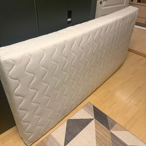 Jysk madrass i hvit farge. Madrassen har bølgemønstret trekk i tekstil. Egnet til bruk i seng eller som ekstra madrass i gjesterom eller tilsvarende. Ligget under overmadrass, så det ny ut.