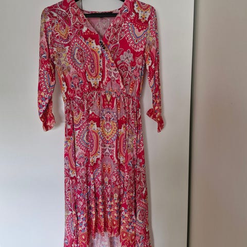 Johnny Was sommerkjole for dame i størrelse L. Kjolen er rød med mønstret trykk i kontrastfarger. Materiale i viskose. Modellen har knapper i front og markert liv med rynkedetaljer. Ermene er middels lange med løs passform. Stoffet er lett og faller mykt, egnet for bruk i varme årstider eller som lett hverdagskjole.