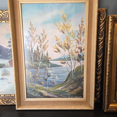 J A Miller akvarell original signert kunst landskap trehus blå hytte maleri håndmalt norsk kunst 2005 vintage ramme