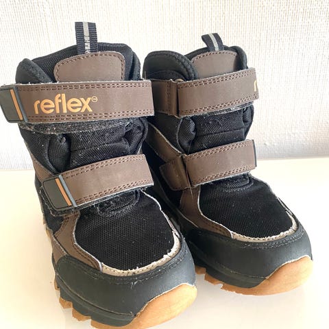 Lilla overgangssko i størrelse 26, fra Reflex/barnas hus. Skoene har høyt skaft med borrelås og elastisk stramming foran for enkel av- og påkledning. Overdel i tekstil og syntetisk materiale med forsterkninger på tå og hæl. Grovmønstret yttersåle i gummi gir godt grep på underlaget.