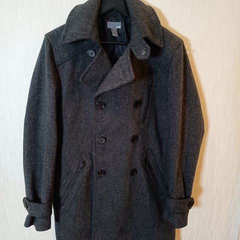 Raglanskuldre og skråstilte lommer på begge sider. Den lyse siden er en veldig lys beige, mens ullsiden er grå/brun/svart hundetannsmønster.