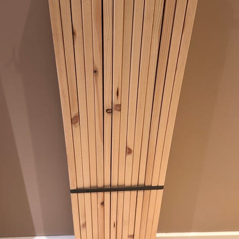 Avlastingsbord / armlene bord til brede sofaarmlener. Disse er satt sammen av trespiler på stoff, slik at det kan tilpasses ulike bredder.