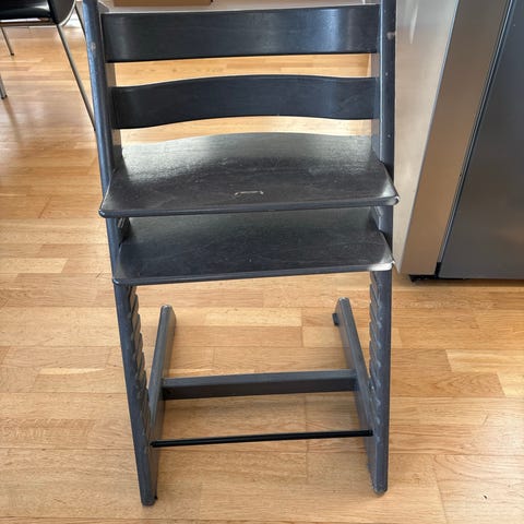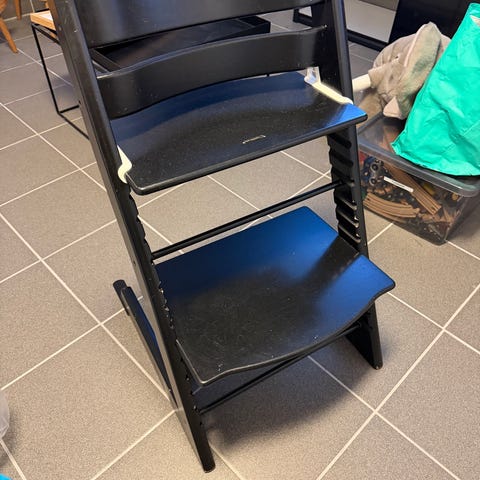 Stokke Tripp Trapp høy barnestol i grått tre. Stolen har justerbart sete og fotbrett som kan tilpasses barnets høyde. Klassisk trappekonstruksjon gir god sitteposisjon ved bordet. Egnet som barnestol ved spisebord eller arbeidsbord. Laget i treverk med metallstag for ekstra stabilitet.