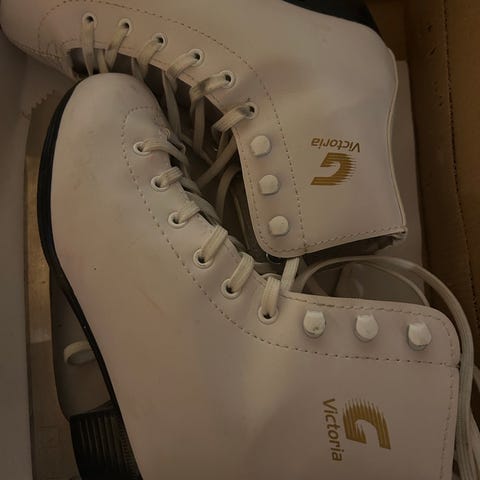 Victoria kunstløpskøyter for barn i størrelse 33. Klassiske hvite skøyter med snøring foran og støttende ankelparti. Egnet til generell skøytebruk og enkel kunstløpstrening på is.
