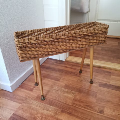 Gammel magasinholder i bast/ tre selges til første som henter. Jeg har hatt quiltelinjaler i den men er egentlig en aviskurv eller magasinholder