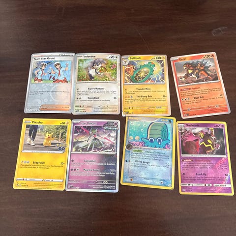 Pokémon samlekort blandet lot. Inneholder ulike kort fra Pokémon Trading Card Game i forskjellige typer og farger. Kortene kan brukes til samling eller spill. Antall, serier og årganger fremgår ikke tydelig av bildene og kan derfor variere i loten.