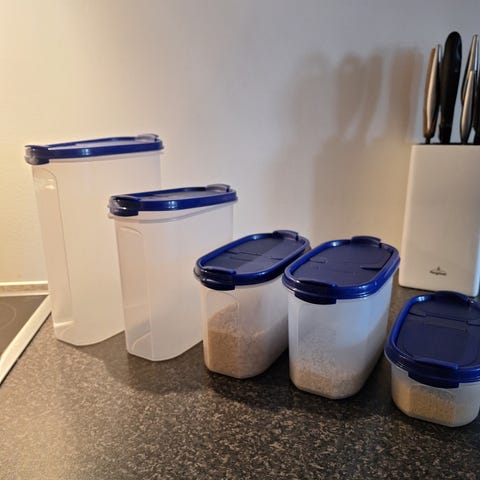 Tupperware 3 moduletter oppbevaringsbokser i plast med blå lokk. Settet består av tre rektangulære bokser i ulik høyde, egnet til tørrvarer som mel, sukker, pasta eller kornprodukter. Boksene er gjennomskinnelige slik at innholdet er synlig, og lokkene er tilpasset for å sitte tett. Passer til organisering av skap og skuffer på kjøkkenet. 3 stk selges samlet for 300 kr . Kan sendes med post nord for 135 kr eller fiks ferdig eller kan hentes etter avtale . Kan og sendes med posten til 140 kr om ønskelig .
