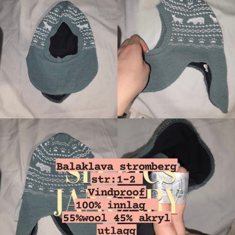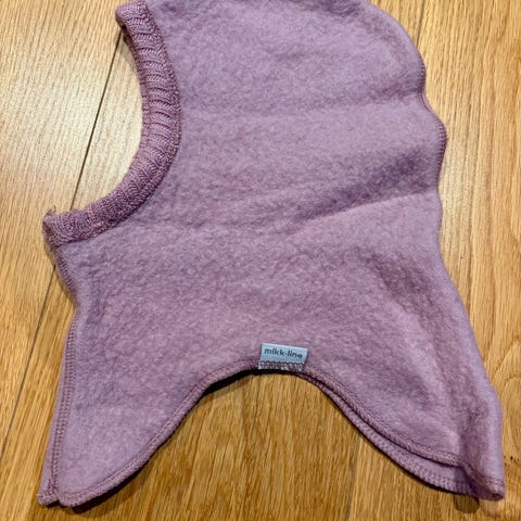Balaklava i størrelse 1 (stor i str, mer som 2-3). Farge lilla/ plomme og laget i bomull.