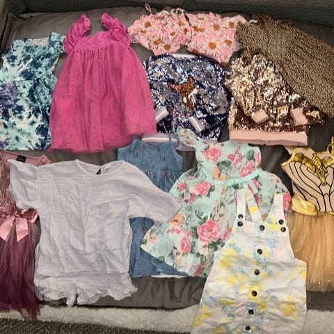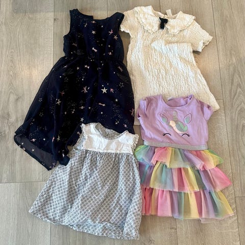 Barneklær for jente i størrelse 5-7 år i flerfargede varianter. Pakken inneholder ulike plagg som kjoler, bukser, gensere og andre over- og underdeler i flere farger og mønstre. Noen plagg er lite brukt, andre plagg mer brukt. Bruksmerker kan forekomme. Skoene er i str 28