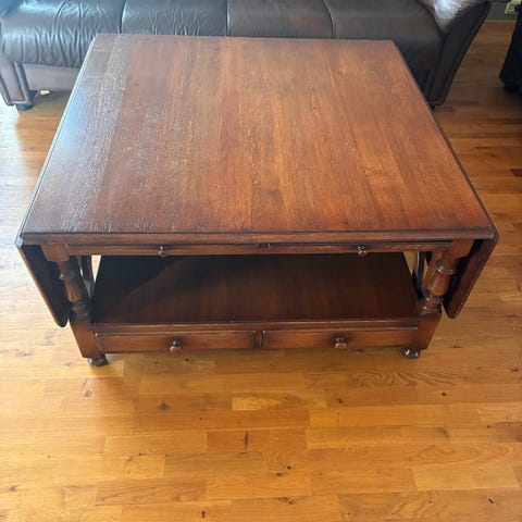 Hel tre, plasseringsvennlig salongbord med en hylle under. 2 klaffer på sidene.