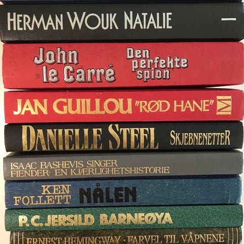 Bokpakke med 10 stk innbundne bøker av ulike forfattere. Bøkene har hovedsakelig harde permer i ulike farger og design. Egner seg for lesing eller som innslag i bokhylle og samling. Flere sjangre og titler er representert i pakken.