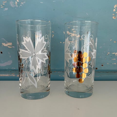 4 stilige drikkeglass med plasthank selges samlet.